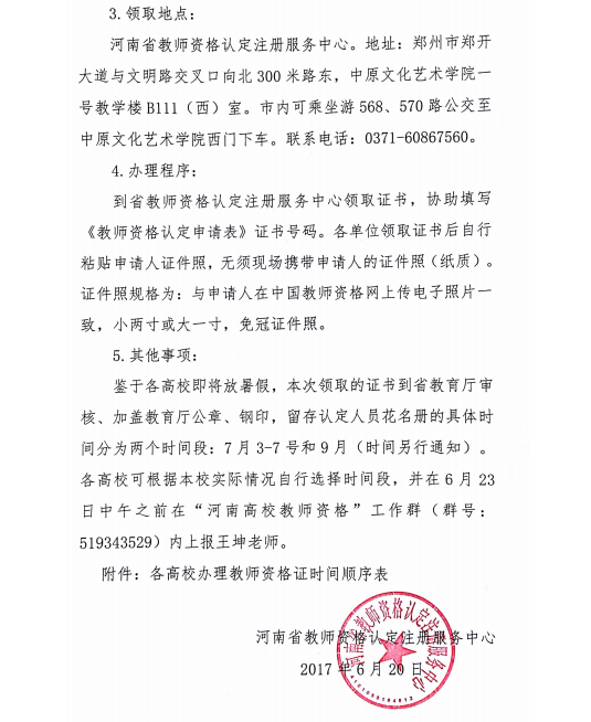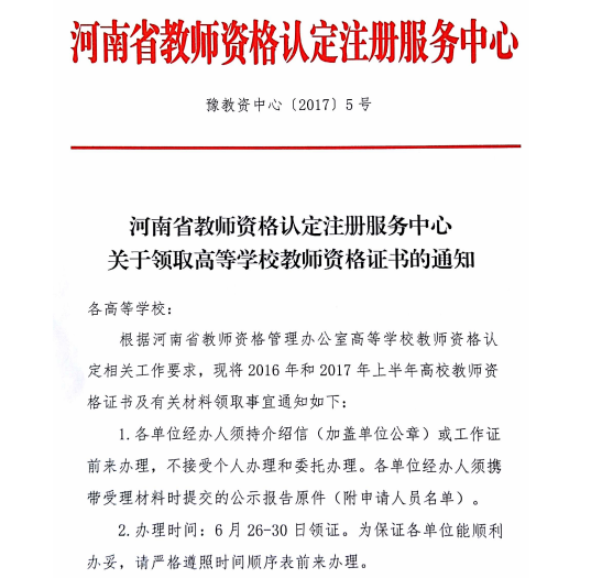 转发豫教资中心《关于领取高等学校教师资格证书的通知》