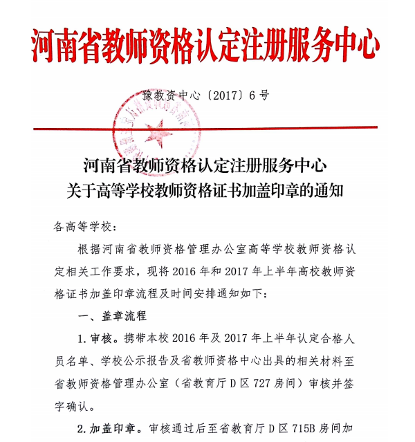 转发豫教资中心《关于高校教师资格证书加盖印章的通知》